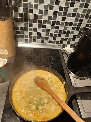 Cebulę siekamy , marchewkę kroimy w cienkie patyczki. Warzywa te podsmażamy na maśle , dodajemy kurczaka. Doprawiamy sosem sojowym i smażymy. Podlewamy odrobiną wody ok 1 szklanka .Dodajemy curry i chilli do smaku. Dusimy . Dodajemy mleczko kokosowe i pędy bambusa. Dusimy jeszcze chwilę . Dodajemy pokrojoną dymkę. Podajemy z ryżem .